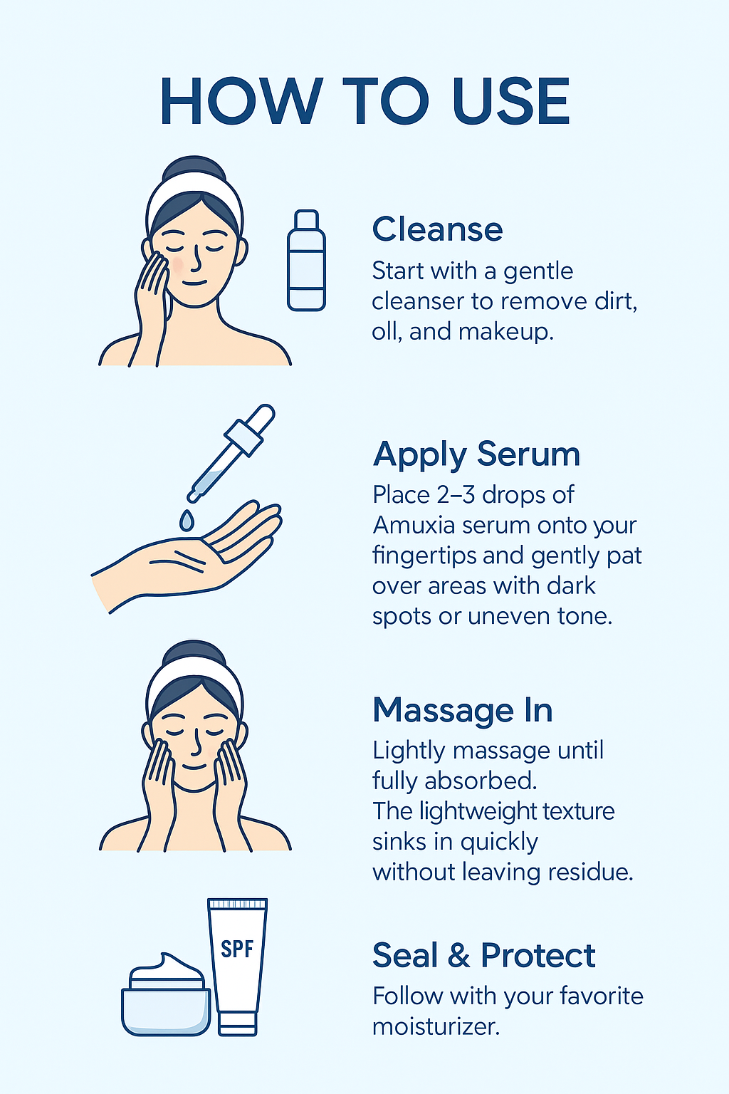 Place 2–3 drops of Amuxia serum onto your fingertips and gently pat over areas with dark spots or uneven tone.